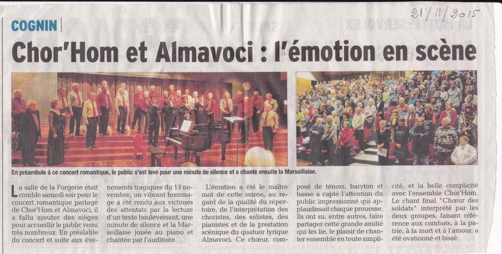 Beaucoup d'émotion et de sensibilité pour notre concert du 21 novembre 2015 à la salle de la Forgerie de Cognin , avec le quatuor masculin ALMAVOCI