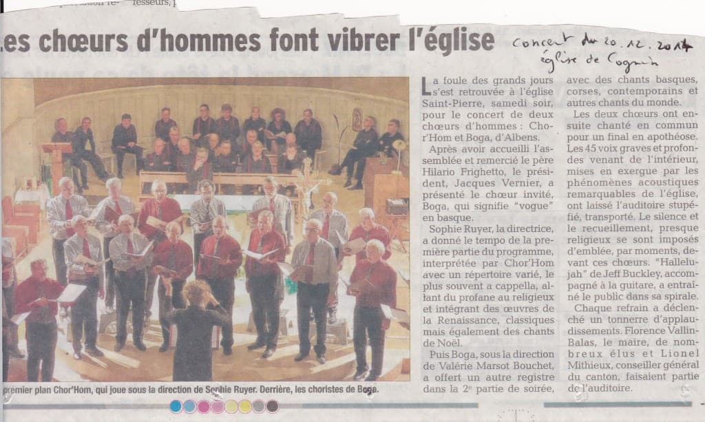 Concert de Noël du 20 décembre 2014 avec le choeur d'hommes d'Albens les Boga", un beau succès, que du plaisir